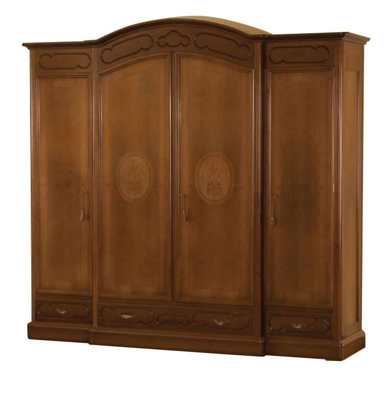 Armadio Francia a 4 ante, intarsiato, con cappello lavorato, disponibile in noce e ciliegio_art. B/306 Dimensioni: 255x63x245h