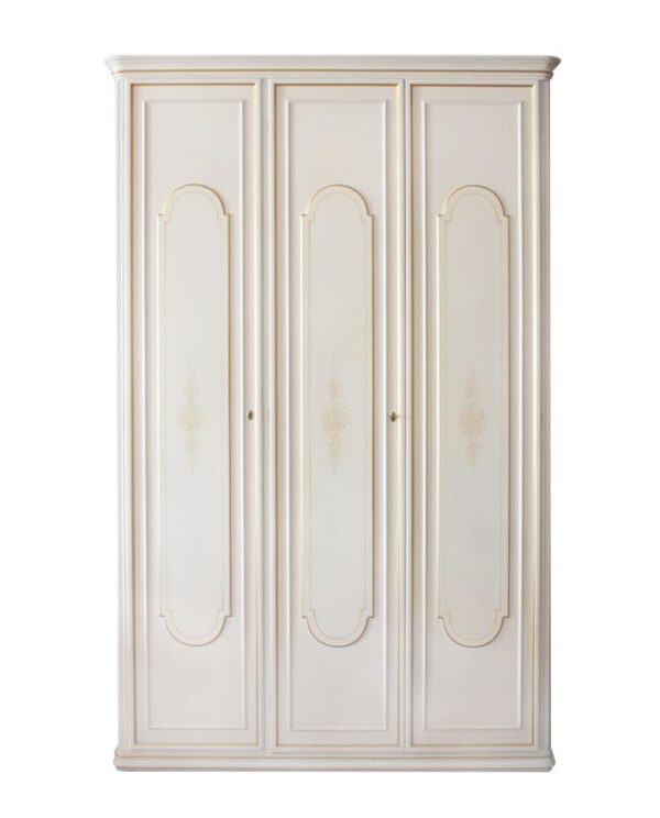Armadio laccato avorio, particolari in foglia oro decorati a mano, ovaloni centrali, a 3 ante_art. B/104 Dimensioni: 160x62x262h