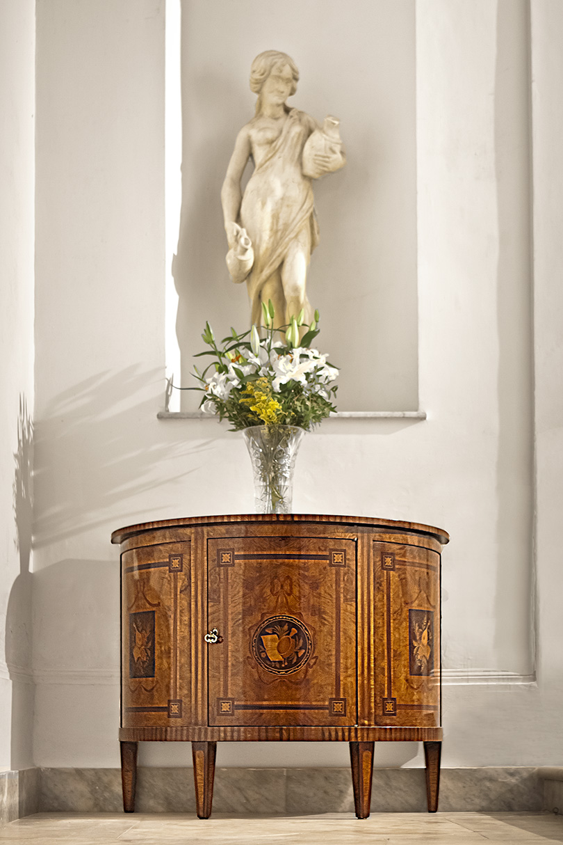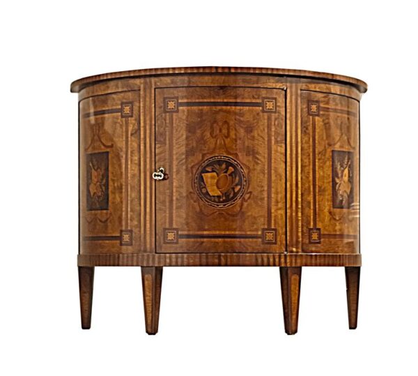 Mobile mezzaluna in radica in stile neoclassico ad un’anta, intarsi raffiguranti strumenti musicali interamente eseguiti a mano _art. I/2000