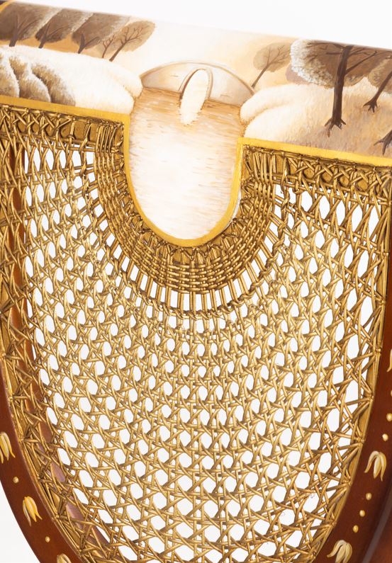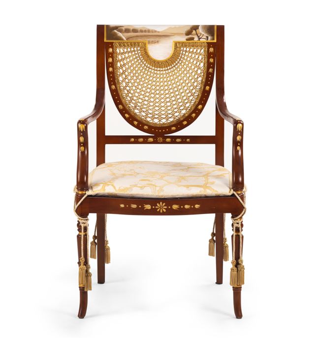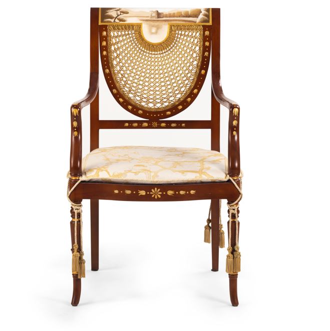 Poltroncina in stile neoclassico decorata a mano, cuscino imbottito con cineserie ricamate Rubelli. Schienale intrecciato a mano in paglia di Vienna e decorato con quadro dipinto personalizzato. Disponibili n. 4 poltroncine decorate con quattro differenti quadri dipinti_art. E/1123