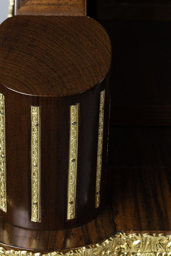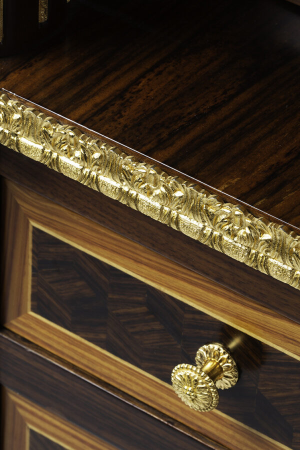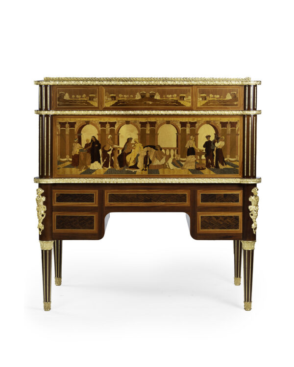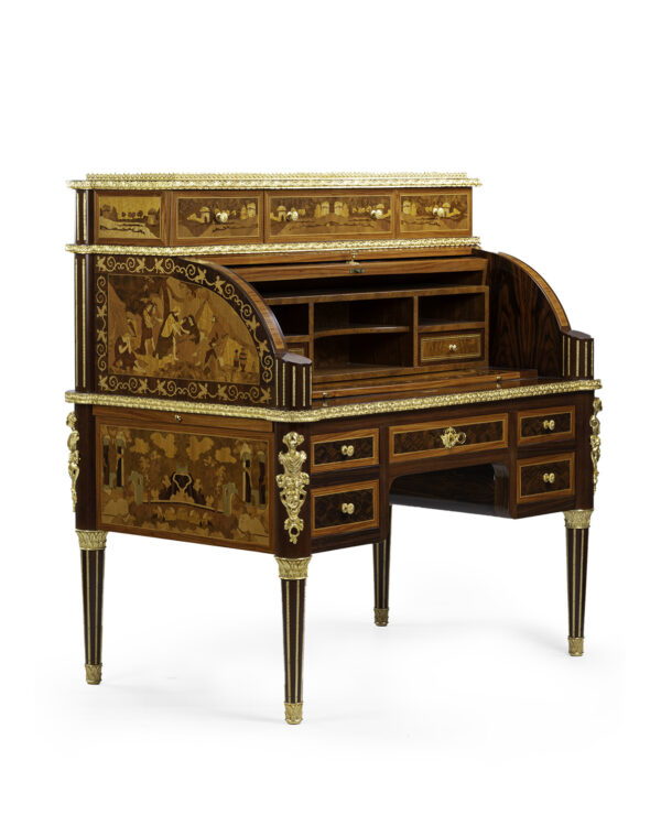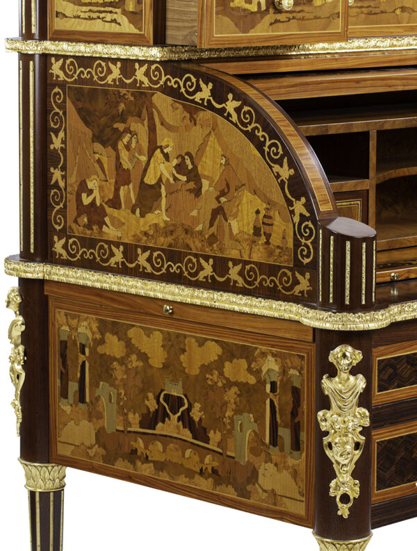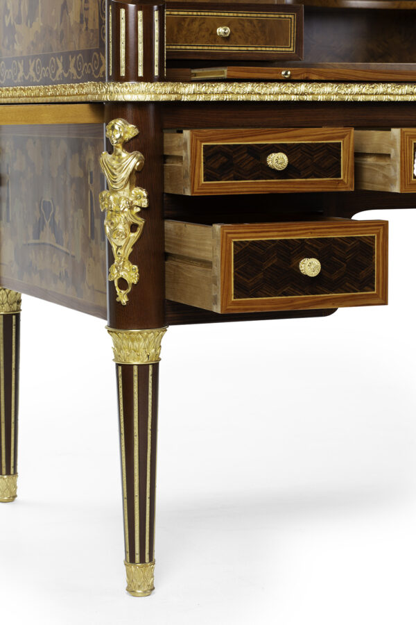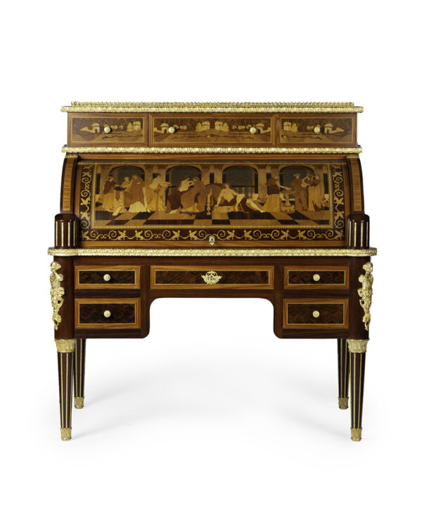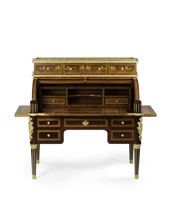 Scrittoio Rouleau Napoleone III centrostanza. I raffinati intarsi sono eseguiti a mano con 15 essenze lignee pluricentenarie e legni tinti a mano secondo le antiche tecniche dei maestri ebanisti italiani e madreperla a rilievo.
