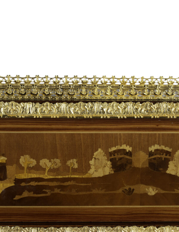 L'intarsio raffigura “Le Nozze di Aldobrandini”, affresco dell’omonima sala della Biblioteca Apostolica Vaticana. Bronzi finemente cesellati a mano e galvanizzati oro 24 kt alla francese.