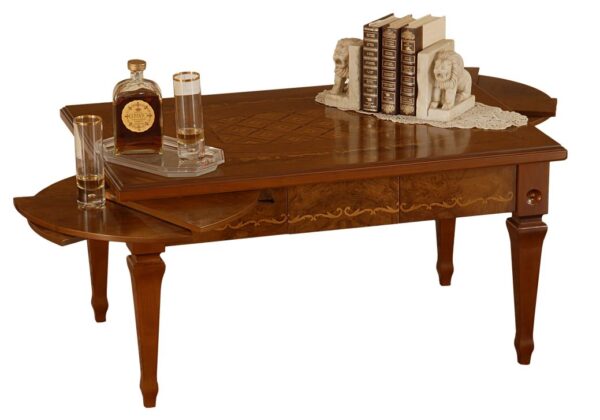 Tavolino rettangolare intarsiato con piedi a piramide e cassetto centrale, alette laterali apribili a ventaglio_art. E/300