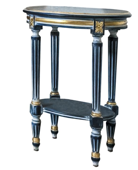 Tavolino alto Luigi XVI intagliato, finitura blue anticato, particolari in foglia oro_art. T/1013 bis Dimensione: 46 x 37 x 66H