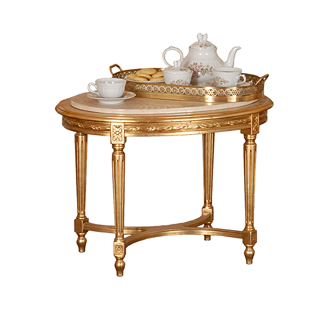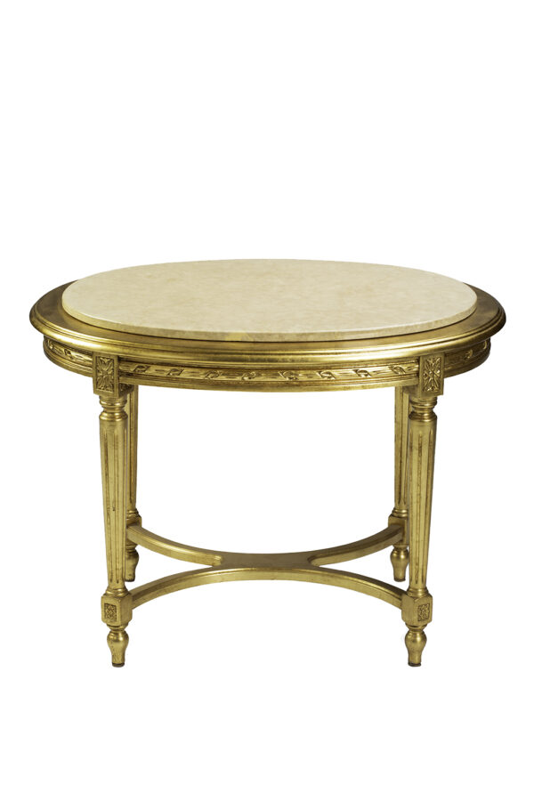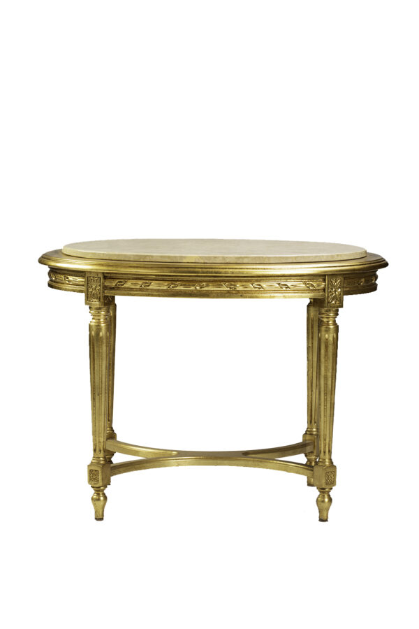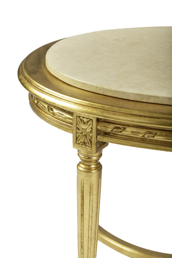 Tavolino stile Luigi XVI intagliato con finitura in foglia oro, top ovale in marmo_art.E/100