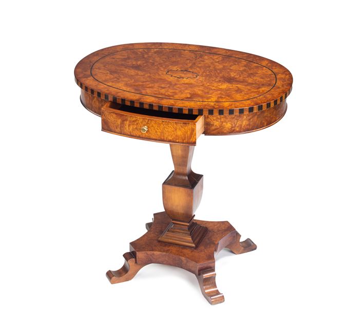 Tavolino ovale in radica con cassettino e piede tornito, basamento a 4 piedini intagliati_art. T/1101