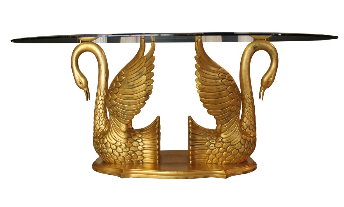 Tavolo Cultura ispirato allo stile Liberty raffigurante due cigni, struttura in legno massello intagliato a mano, finitura foglia oro anticata. Top in cristallo ovale con molatura larga.